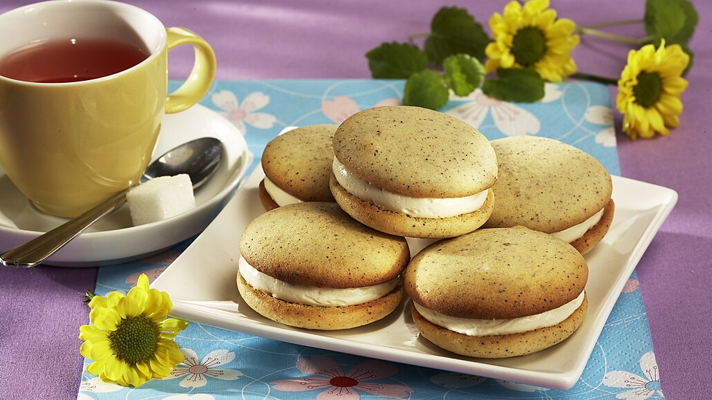 - Ze změklého másla, z cukru a z vaječného likéru vyšleháme hladký krém. Vychladlé piškotky opatrně odtrhneme od papíru, na kterém se pekly, a po dvou je propojíme krémem.