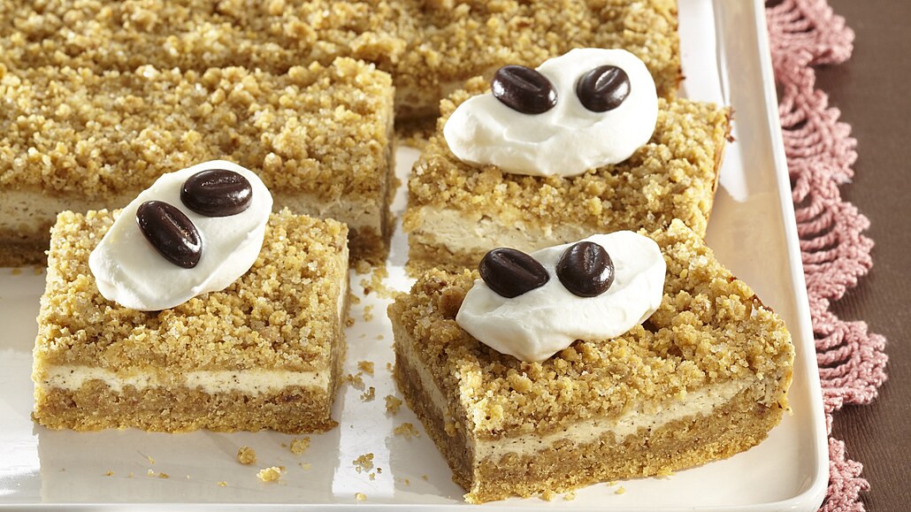 - Před podáváním koláč nakrájíme. Každý kousek dozdobíme kopečkem zakysané smetany a čokoládovými kávovými zrny.