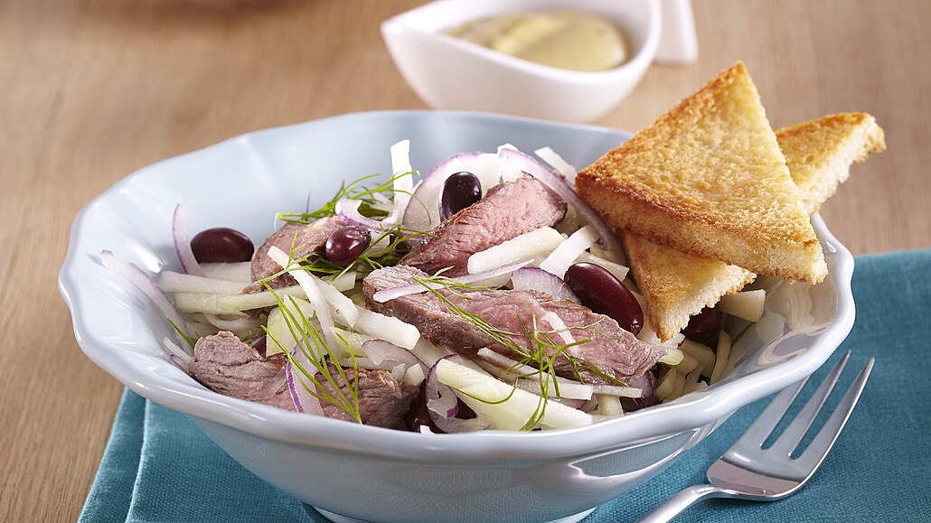 - Salát rozdělíme do misek a doplníme nudličkami opečeného masa. Pokapeme zálivkou a podáváme.