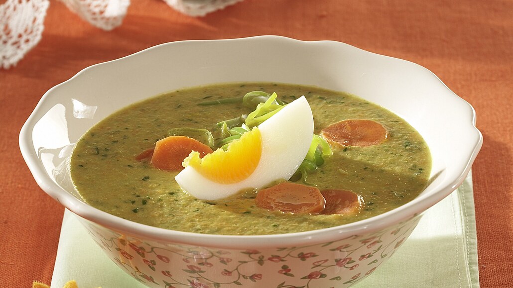 - Polévku rozdělíme do talířů, přidáme vařená vejce a ozdobíme lístky kerblíku, pórkem a kolečky mrkve.