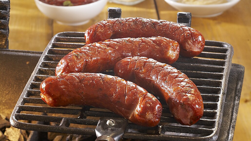 - Klobásky na grilování ostrým nožem nařízneme. Položíme je na rozehřátý rošt a grilujeme 10 - 15 minut. Během grilování klobásky otáčíme, ale nepícháme do nich vidličkou, aby nevytekla šťáva.