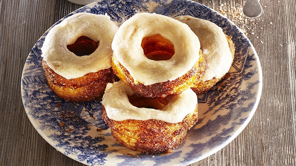 - Rozehřáté máslo vyšleháme s moučkovým cukrem, citronovou šťávou a vanilkovým extraktem. Pomocí štětce potíráme povrch koblih a podáváme.