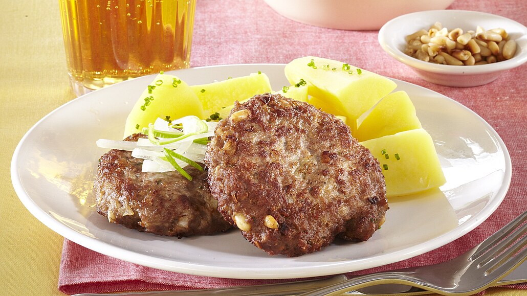 - Z masové směsi tvarujeme mokrýma rukama placičky, které opečeme na olivovém oleji po obou stranách dozlatova. Podáváme je s bramborami a salátem a posypeme nakrájenou cibulkou.