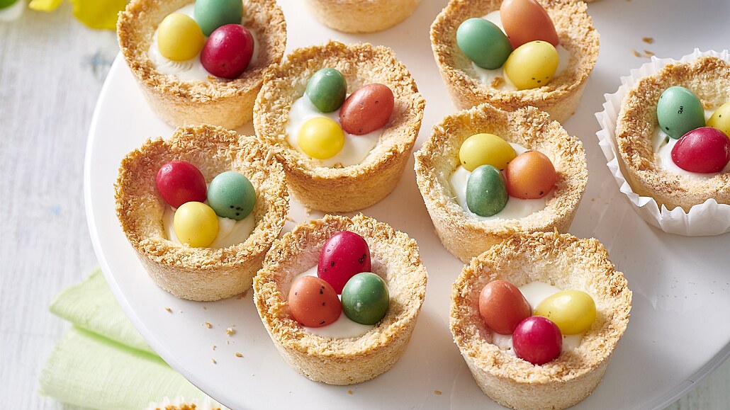 - Formu na mini muffiny vymažeme olejem a do mističek rozdělíme pomocí lžíce připravenou kokosovou hmotu. Prsty ji natlačíme na dno a strany každé mističky tak, aby uprostřed vznikla malá prohlubeň. Kokosové korpusy pečeme v troubě předehřáté na 160 °C asi 20 – 25 minut do světle zlatavé barvy. Upečená hnízda necháme asi 5 minut zchladnout ve formě. Poté je opatrně vyndáme, přendáme na kovovou mřížku a necháme zcela vychladnout.