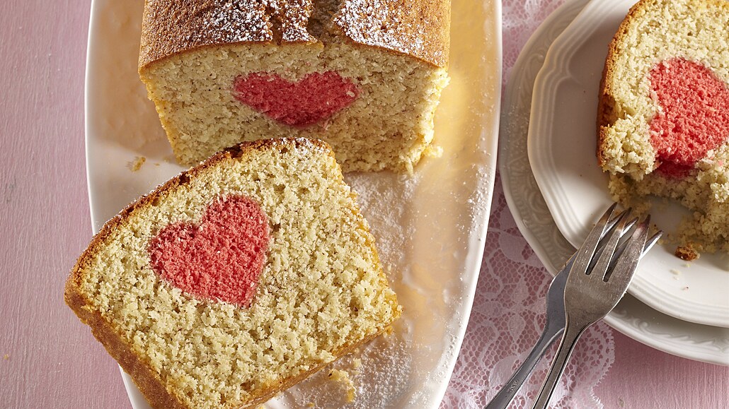 - Formu na chlebíček vyložíme pečicím papírem a nalijeme do ní asi polovinu neobarveného těsta. Na těsto naskládáme vykrojená srdíčka těsně za sebe tak, aby vznikla řada, a zlehka je vtlačíme do těsta. Srdíčka zalijeme zbylým těstem a pečeme při 180 °C asi 45 minut. Necháme vychladnout a rozkrájíme na porce. Před podáváním posypeme moučkovým cukrem.