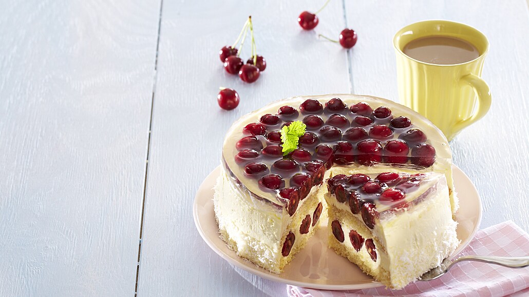 - Po ztuhnutí uděláme okolo dortu lem z alobalu a třešně zalijeme dortovým želé, které připravíme podle návodu na obalu. Necháme opět ztuhnout, pak sundáme alobal a dort obalíme do poloviny v kokosu.