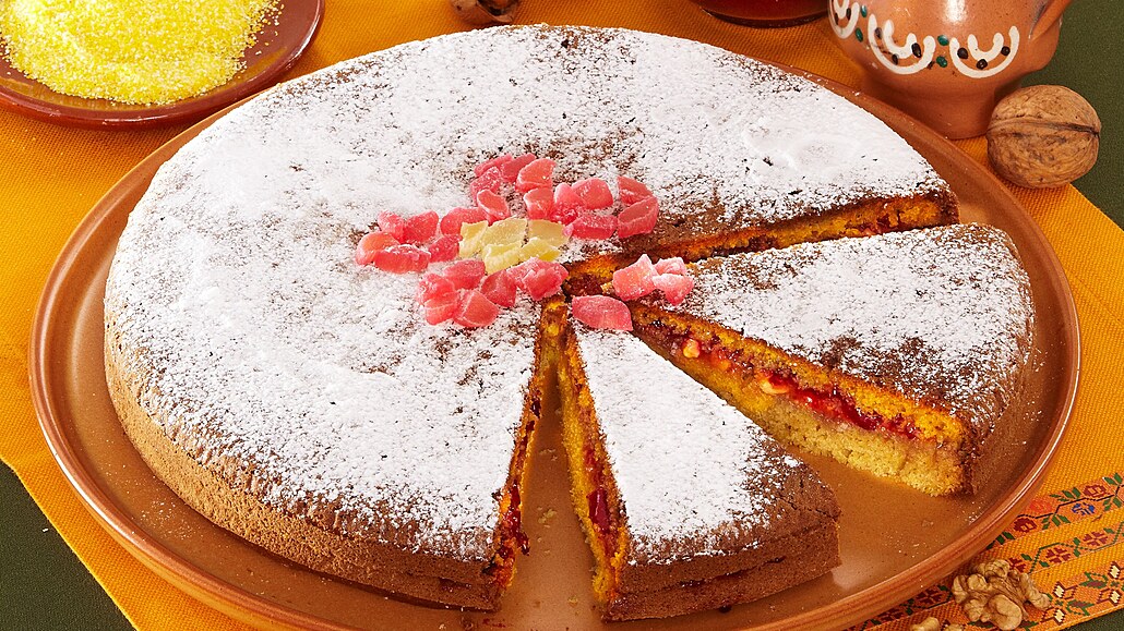 - Korpus necháme zchladnout a rozkrojíme na dvě vrstvy. Spodní potřeme džemem a posypeme uasekanými ořechy. Obě půlky slepíme a povrch posypeme moučkovým cukrem. Koláč můžeme také ozdobit kandovaným ovocem.
