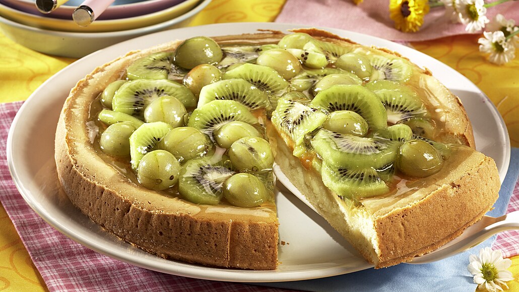 - Kiwi oloupeme a nakrájíme na plátky. Angrešt očistíme. Vychladlý korpus vyjmeme z formy, potřeme zavařeninou a poklademe ovocem.