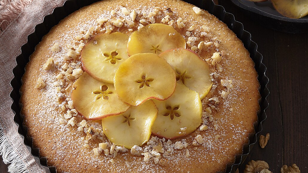 - Opékáme do zlatova z obou stran. Vychladlý koláč podáváme ozdobený karamelovými jablky a posypaný nasekanými ořechy.