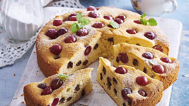 - Po upečení necháme vychladnout ve formě a pak ho vyjmeme. Před podáváním můžeme koláč lehce pocukrovat a dozdobit snítky máty.