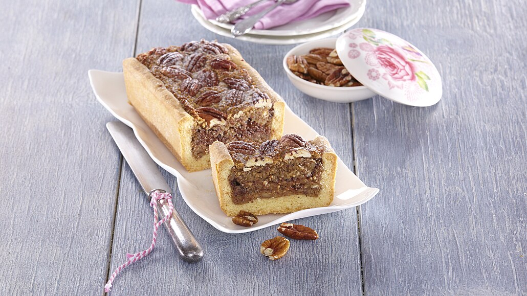 - Odležené těsto rozválíme na obdélník dlouhý 30 cm a široký 20 cm. Přendáme ho na pečicí papír a i s papírem vložíme do chlebíčkové formy. Na dno rozetřeme třetinu ořechové náplně, posypeme ji polovinou nakrájené čokolády a rozetřeme druhou třetinu ořechové náplně. Nasypeme zbytek čokolády a rozetřeme zbylou náplň. Na povrch naskládáme zbylé pekanové ořechy.