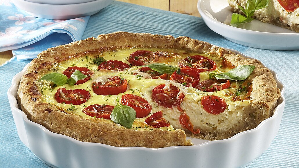 - Koláčový korpus přelijeme smetanovou náplní a poklademe rajčaty. Nakonec vše posypeme nastrouhaným sýrem. Koláč vrátíme do trouby a při 180 °C dopečeme. Hotový koláč dozdobíme bazalkou.