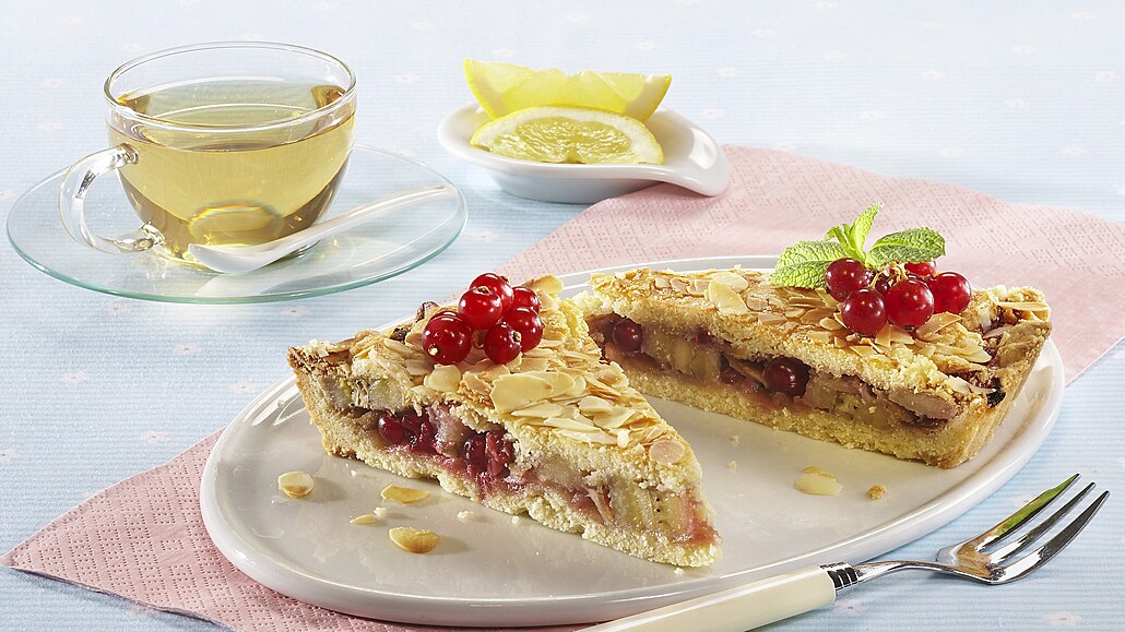 - Těsto rozdělíme na dvě části. Větší část rozválíme, vložíme ji do formy a propícháme vidličkou. Okraj těsta potřeme vodou. Banán nakrájíme na plátky, pokapeme citronem a posypeme cukrem. Přidáme část mandlových lupínků, očištěný rybíz, mletou skořici a nakonec zlehka vmícháme pevný sníh z bílků.