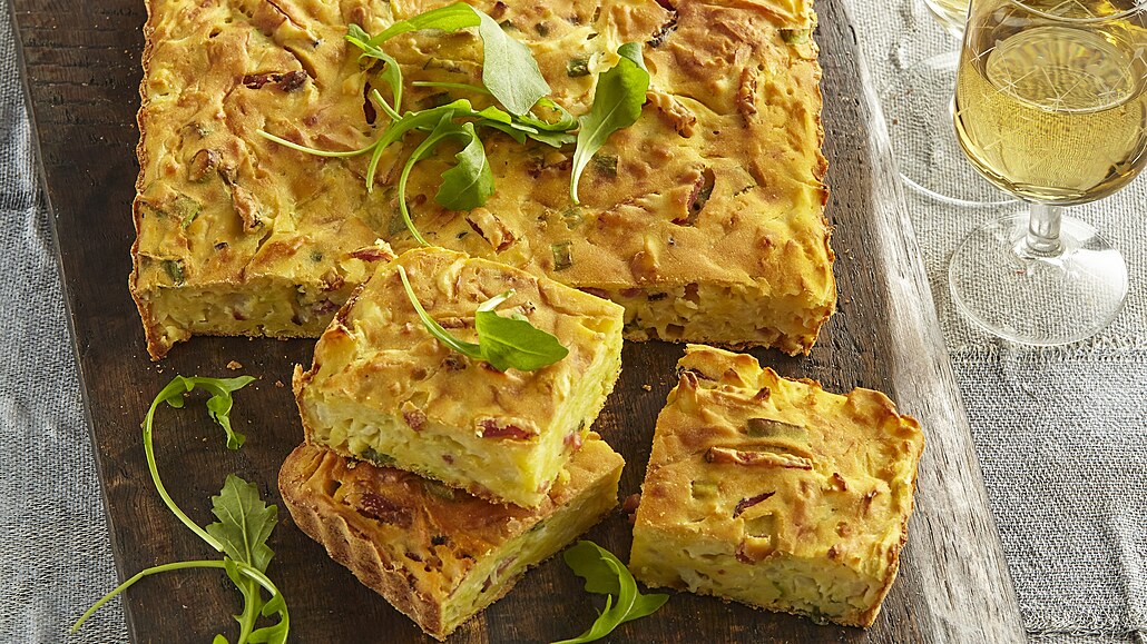- Tekutou směs nalijeme do tukem vymazaného pekáčku a pečeme v předehřáté troubě při 180 °C asi 30 minut. Hotový koláč můžeme podávat teplý i studený. Chuť můžeme zintenzivnit například přidáním čerstvé rukoly.