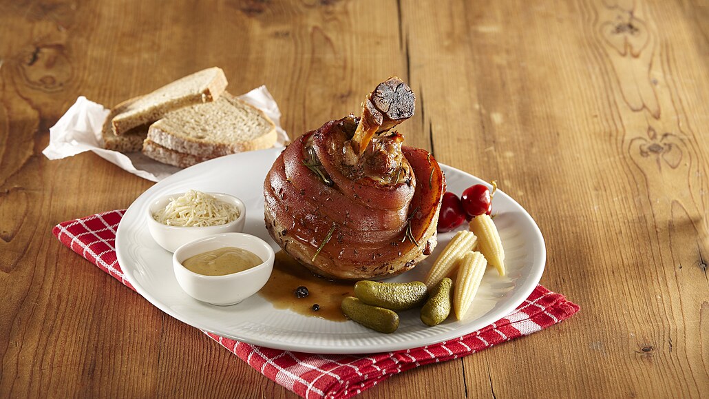 - Pak teplotu snížíme na 170 °C a kolena dále pečeme - průběžně je přeléváme pivem a vývarem. Asi po 1 hodině kůži několikrát nařízneme tak, aby mohl vytékat tuk. Kolena posypeme lístky rozmarýnu a pečeme je, dokud se tuk z větší části nevypeče a maso se neoddělí od kosti. Dle potřeby kolena obracíme. Podáváme s nastrouhaným křenem, hořčicí, nakládanou zeleninou a čerstvým pečivem.