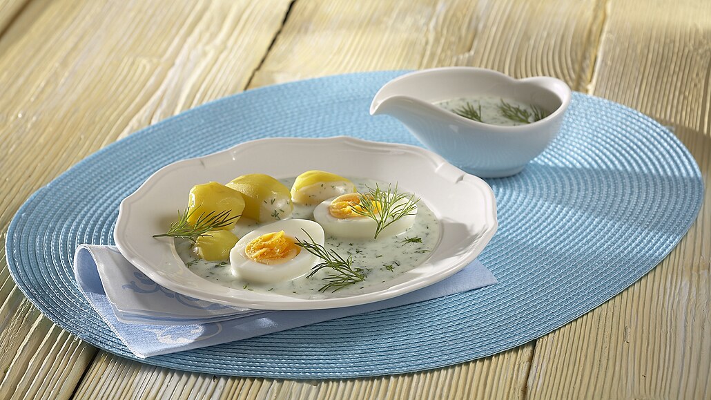 - Vejce vaříme asi 5 minut na hniličku. Prudce je zchladíme, opatrně oloupeme a vložíme do omáčky, ve které je prohřejeme. Koprovou omáčku rozdělíme na talíře, přidáme vejce a podáváme s vařenými bramborami.