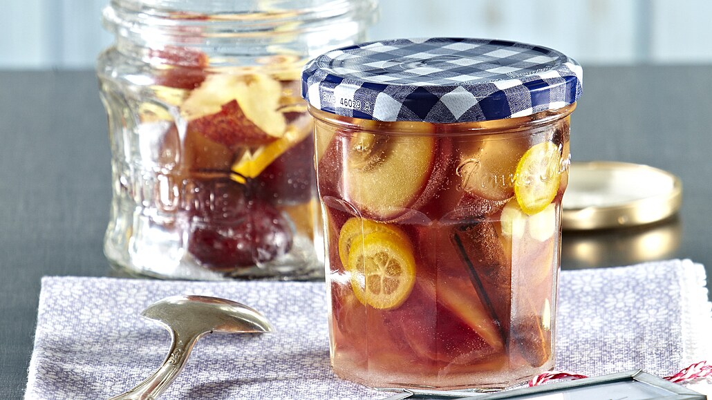 - Kumquat opláchneme a nakrájíme na plátky. Zázvor oloupeme a nakrájíme na plátky. Ryngle opláchneme, rozkrojíme na čtvrtiny a zbavíme pecek. Do sklenice postupně skládáme čtvrtky rynglí. Prokládáme je plátky zázvoru a kumquatu, přidáme koření a postupně prosypáváme cukrem.