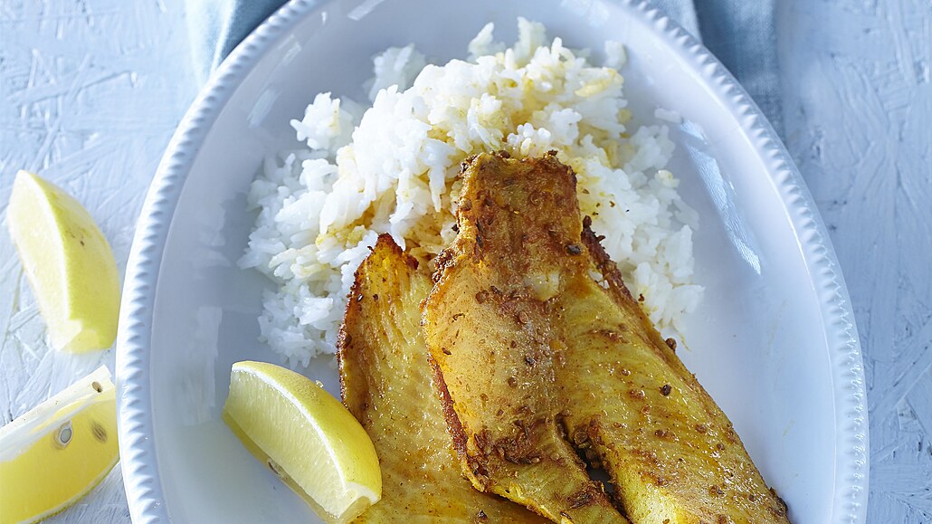 - Koriandr, chilli koření, kurkumu, kmín, sůl a citrusovou šťávu promícháme s asi 6 lžícemi oleje, aby vznikla hustá, poměrně slaná marináda. Potřeme jí rybí steaky po obou stranách a necháme asi 15 minut odležet.