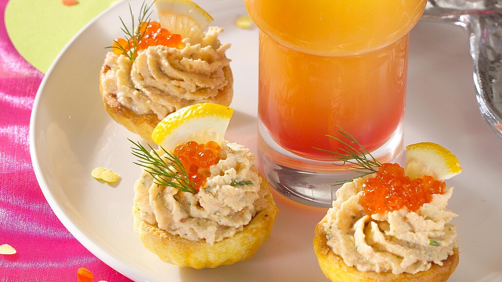 - Těsto rozdělíme na stejně velké kousky, které prsty vtlačíme do formiček ve tvaru košíčků. Vložíme do trouby vyhřáté na 180 °C a pečeme asi 10 minut. Hotové košíčky vyklopíme a necháme vychladnout. Pak je naplníme vychladlou krabí pěnou a dozdobíme kaviárem, kouskem citronu a koprem.
