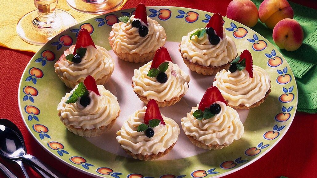 - Zchladlý krém dáme do látkového kornoutu se širším nástavcem a naplníme upečené košíčky. Drobné ovoce omyjeme a košíčky jím ozdobíme.