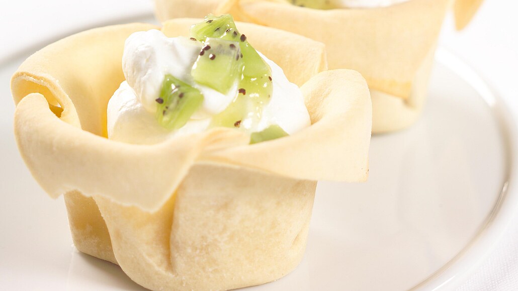 - Kiwi oloupeme, nakrájíme na menší kousky, přidáme cukr a likér a rozmixujeme. Před podáváním polijeme košíčky krémem.