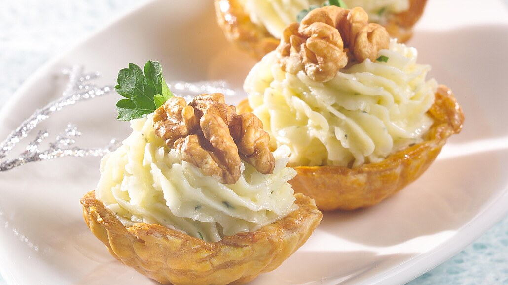- Mezitím připravíme pěnu. Změklé máslo vyšleháme, přidáme najemno nastrouhaný sýr, strouhané ořechy a promícháme. Připravenou pěnu poté nastříkáme do košíčků a ozdobíme půlkou vlašských ořechů.