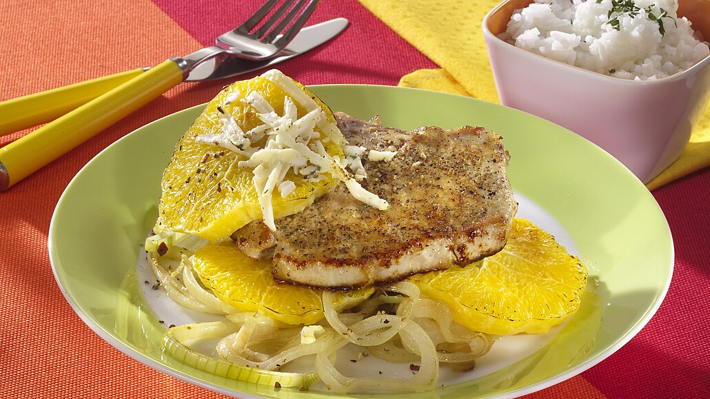 - Když je maso měkké, nasypeme na vrchní vrstvu pomerančů nastrouhanou nivu a necháme ještě krátce zapéct. Kotlety podáváme s vařenou rýží.