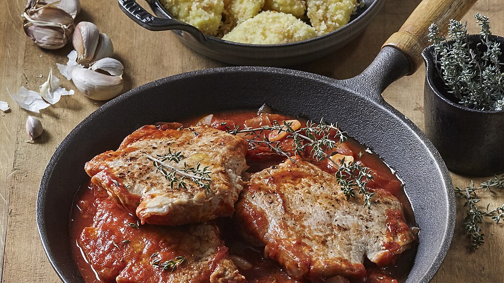 - V kastrolu rozehřejeme olej a opečeme na něm maso z obou stran. Maso vyjmeme a v kastrolu zpěníme najemno pokrájenou cibulku s plátky česneku. Po minutě přidáme rajčata a tymián. Osolíme a do kastrolu vrátíme zpět maso. Vše dáme na cca 15 minut do trouby vyhřáté na 180 °C.