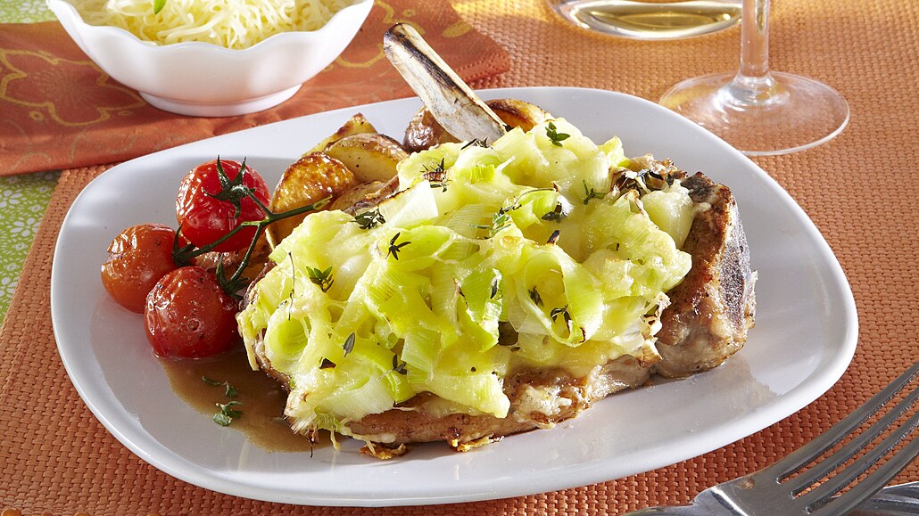 - V míse rozmícháme nastrouhaný sýr s vejci a smetanou. Kotlety odklopíme, maso poklademe zbylým pórkem a přelijeme sýrovou směsí. Podlijeme vodou a odkryté necháme ještě asi 10 - 15 minut při 200 °C dopéct. Podáváme s bramborami a zdobíme opečenými rajčátky.