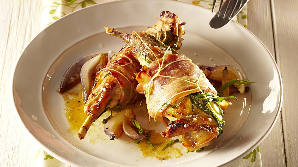 - Maso očistíme, osolíme a opepříme. Přiložíme snítky estragonu, ovineme šunkou a převážeme kuchyňským provázkem. Oloupanou cibuli nakrájíme na měsíčky, poklademe na dno pekáčku a na ně položíme králičí balíčky. Pokapeme olivovým olejem a podlijeme 100 ml vody.