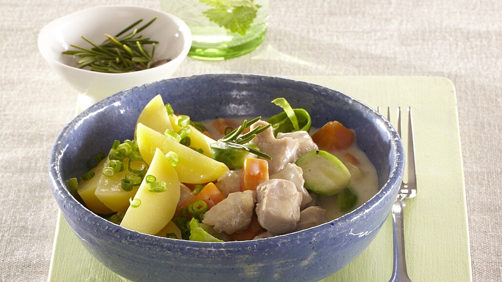 - Na pánvi rozpustíme máslo, přidáme mouku a za stálého míchání připravíme zlatavou jíšku. Vmícháme ji do ragú a necháme provařit. Nakonec přilijeme smetanu, dochutíme solí, pepřem, tymiánem a muškátem a krátce povaříme. Podáváme s bramborami.