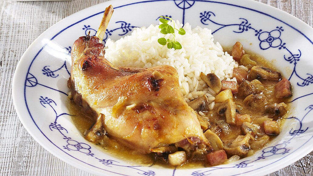 - Stehna vyjmeme z pekáčku, žampionovou směs přendáme do pánve. Dle potřeby přilijeme vývar. Štávu zahustíme moukou rozmíchanou v troše vývaru a asi 5 minut povaříme. Dle potřeby ji dochutíme. Králíka podáváme se žampiony a rýží.