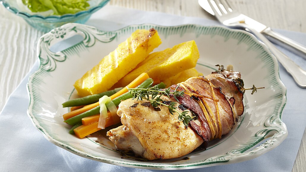 - Ke každému stehnu přiložíme několik snítek tymiánu. Obalíme je ve slanině a upevníme provázkem. Vložíme je pekáčku, podlijeme trochou vývaru a dáme do trouby. Při 190 °C je pečeme asi 30 minut.