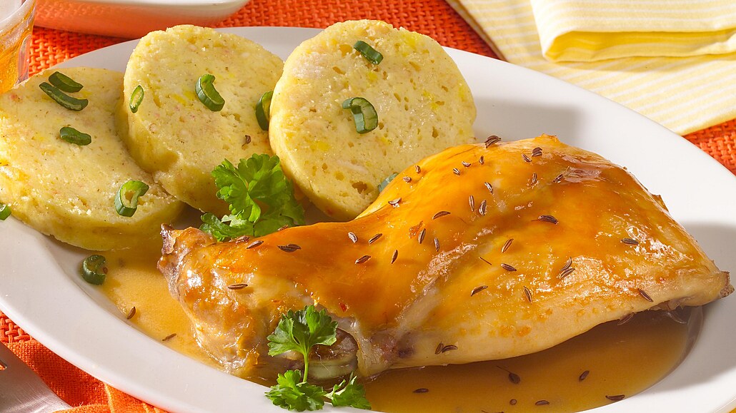 - Nazávěr pekáček odklopíme a maso dopékáme. Když na povrchu zčervená, porce obrátíme a necháme opéct i z druhé strany. Podáváme s červeným zelím a houskovými knedlíky.