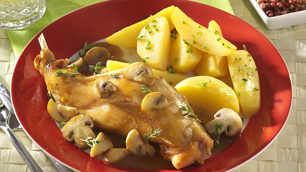 - Výpek dáme na plotýnku, přidáme nakrájené očištěné žampiony a krátce je orestujeme. Zaprášíme moukou a osmahneme. Pak přilijeme asi 200 ml vody a necháme provařit. Hotovou šťávu se žampiony dochutíme solí a pepřem. Porce králíka vložíme zpět do omáčky a prohřejeme. Podáváme vařenými bramborami.