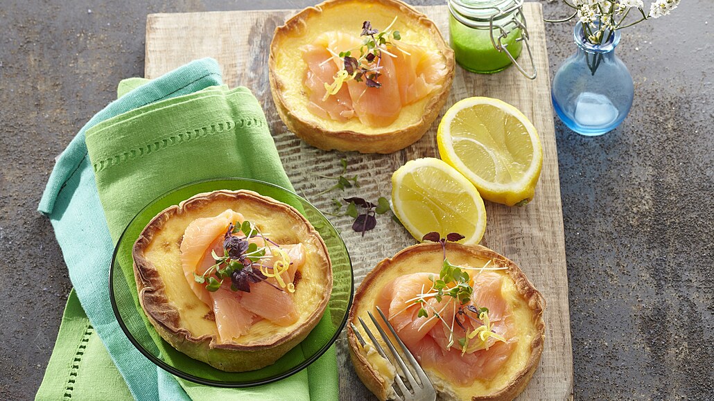- Smetanu rozšleháme se žloutky. Dochutíme solí, pepřem, lžičkou nastrouhané citronové kůry a šťávou z poloviny citronu. Směs vlijeme do předpečených korpusů, vrátíme do trouby a koláčky dále asi 25 minut.