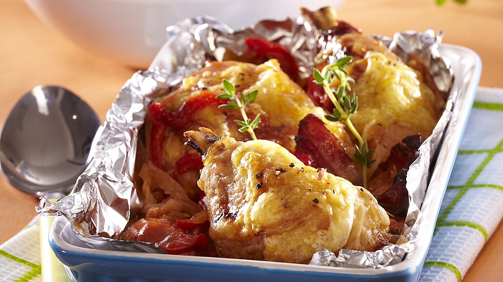 - Kuře opláchneme a osušíme. Rozporcujeme ho, osolíme a opepříme. Pekáč vyložíme alobalem tak, aby přesahoval přes strany a potřeme ho olejem.