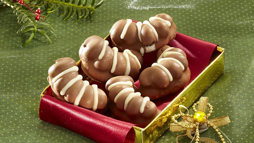 - Krém nastříkáme na upečené korpusy a rohlíčky necháme v chladu zatuhnout. Pak je namočíme do rozpuštěné tmavé čokolády a necháme je zaschnout. Nakonec je pomocí malé papírového kornoutku přestříkáme polevou bílou.