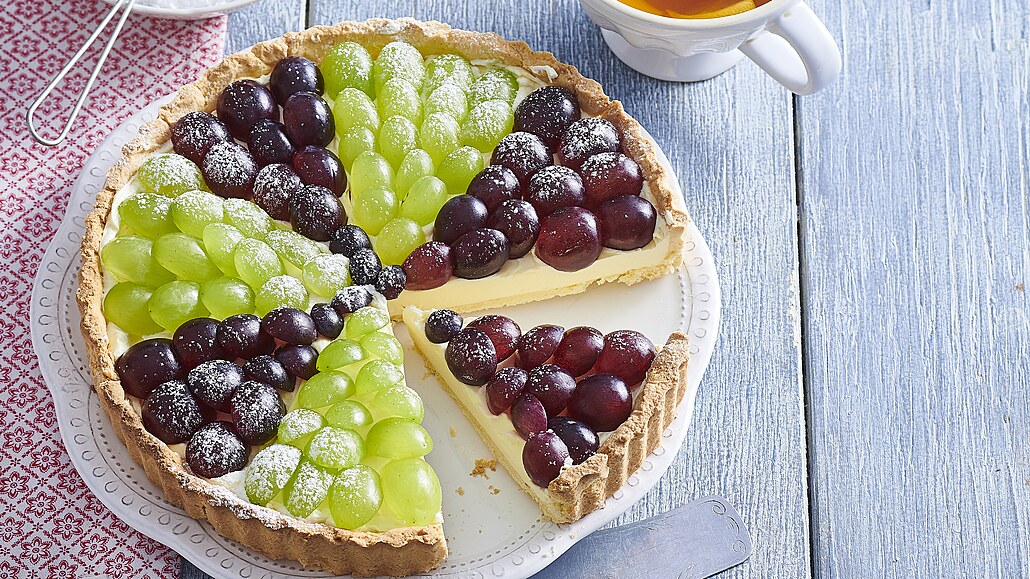Elegantní dezert bez lepku, který sází na kombinaci citronového křehkého těsta a bohatého pudinkového krému s máslem. Šťavnaté bobule hroznového vína pravidelně vyskládané na povrchu dodávají koláči svěžest a neodolatelný vzhled vhodný pro letní slavnosti.