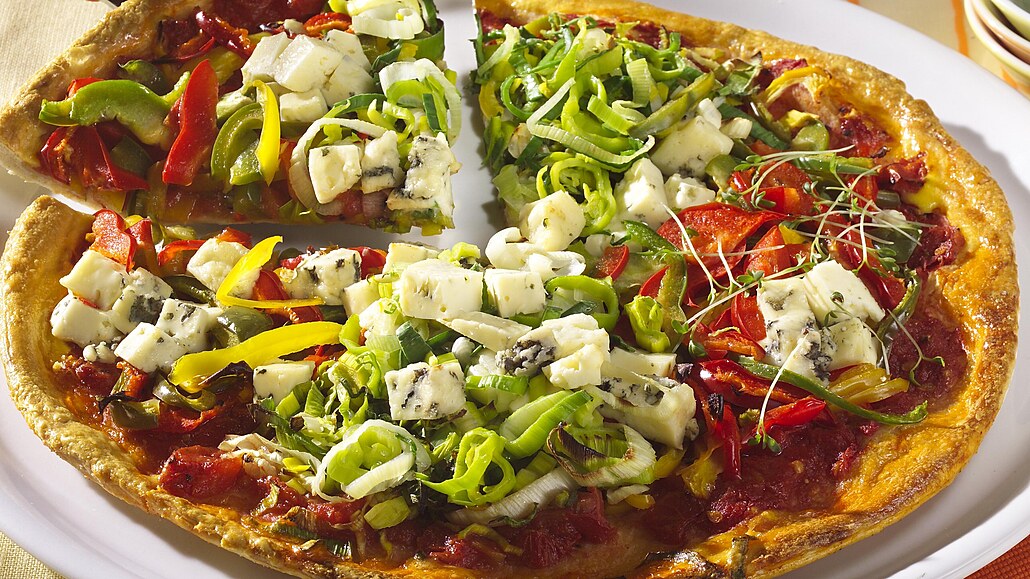 - Pórek a papriku očistíme a nakrájíme na nudličky. Nivu nakrájíme na malé kostičky. Drcená rajčata rozmícháme s nasekanou bazalkou a mletým pepřem. Z vykynutého těsta rozválíme placku a potřeme ji směsí z drcených rajčat tak, aby zůstaly okraje asi 1,5 cm volné.