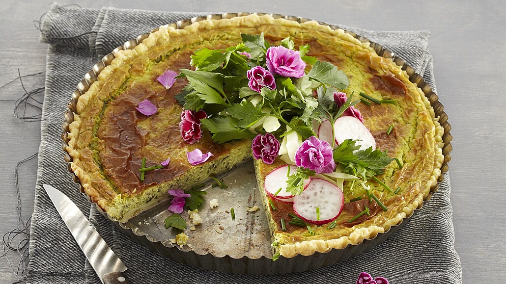 - Koláč vložíme do vyhřáté trouby a pečeme při 200 °C asi 25 minut. Po upečení necháme koláč zchladnout. Před podáváním ozdobíme petrželkou, plátky ředkviček a jedlými květy.