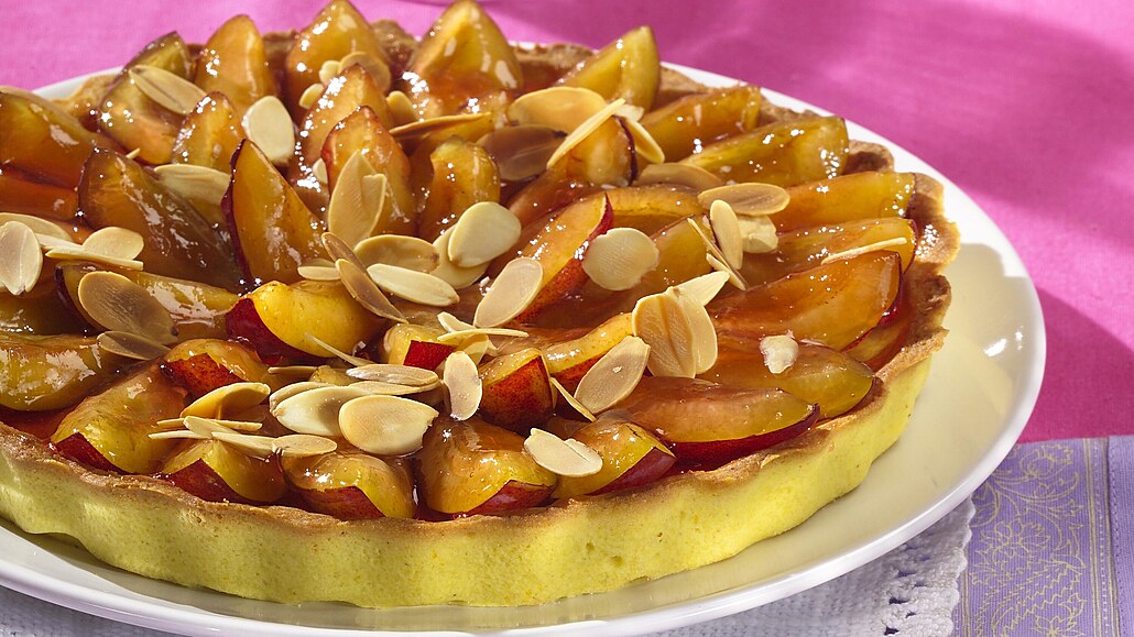 - Vypeckované švestky nakrájíme na čtvrtky a promícháme je s cukrem, solamylem a skořicí. Ochucené švestky naskládáme do pravidelných kruhů na připravené těsto. Povrch posypeme mandlovými lupínky. Pečeme ve troubě předehřáté na 180 °C asi 40 minut. Hotový koláč můžeme ještě lehce poprášit skořicovým cukrem.