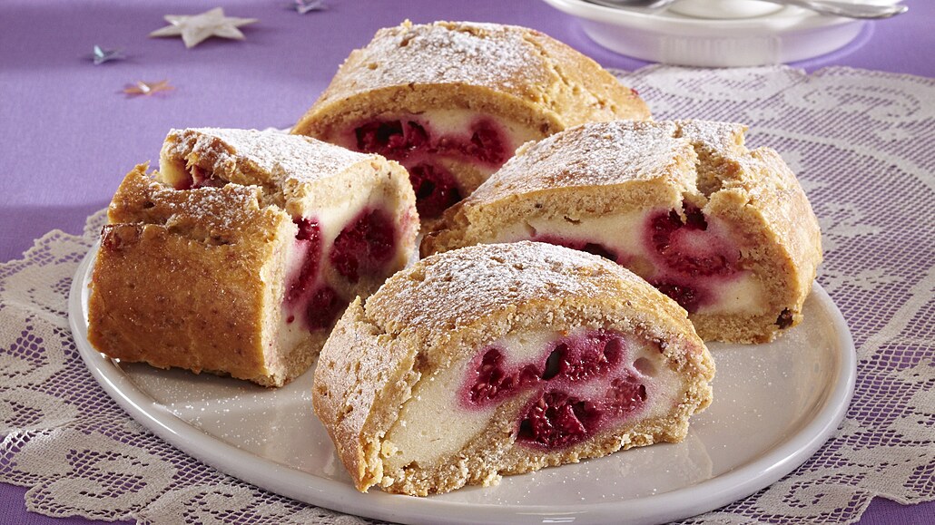 - Odleželé těsto rozválíme na plát silný 4 mm. Střed posypeme strouhankou, potřeme tvarohovou náplní a poklademe malinami.