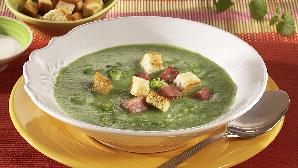 - Polévku rozmixujeme ponorným mixérem dohladka, zjemníme ji smetanou a krátce provaříme. Potom ji rozdělíme do misek, doplníme masem a krutonky.