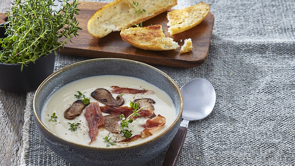 Krémová houbová polévka s pórkem, bílým vínem a opečenou šunkou – Elegantní recept pro náročné gurmány