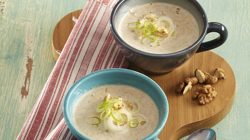 - Hotovou polévku rozmixujeme a nakonec do ní vlijeme teplé sójové mléko a promícháme. Rozdělíme ji do talířků, ozdobíme jarní cibulkou a ořechy a podáváme s pečivem.