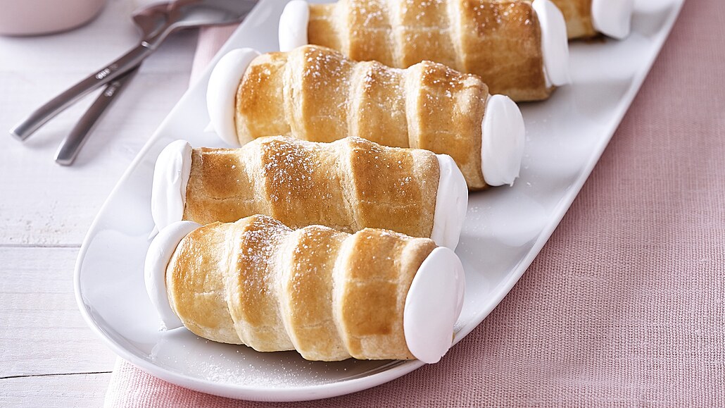 - Odleželé těsto rozdělíme na 2 díly a na pomoučněném vále rozválíme každou část na plát 25 x 45 cm. Podél kratší strany je rozkrájíme na pruhy široké 3 cm. Kovové trubičky na kremrole potřeme tukem a na každou natočíme pruh těsta tak, aby se kraje lehce překrývaly. Rozložíme je na plechy s pečicím papírem a potřeme rozšlehaným vejcem. Pečeme v troubě předehřáté na 170 °C asi 15 minut. Korpusy necháme krátce zchladnout na trubičkách. Pak je opatrně sejmeme a necháme vychladnout na kovové mřížce.