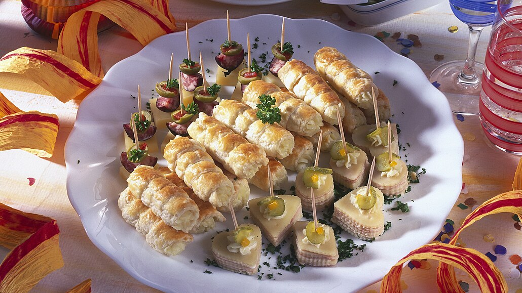 - Spolu s kremrolemi servírujeme sýrové jednohubky, které vykrajujeme ozdobnými tvořítky. jednotlivé vrstvy spíchneme párátkem.