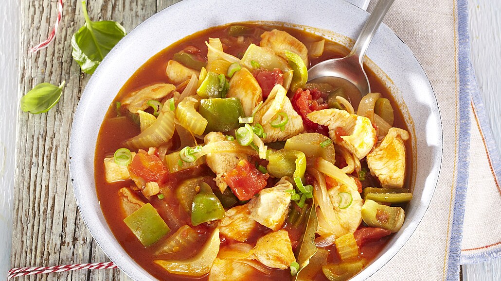- Ke směsi přidáme drcená rajčata, stvol citronové trávy, vmícháme opraženou mouku a zalijeme vše vývarem. Za stálého míchání přivedeme k varu, stáhneme plamen, přidáme nasekané bylinky, jarní cibulku a pozvolna směs prováříme - asi 15-20 minut. Na závěr vložíme opečené maso, prohřejeme ho a pokrm podáváme s rýží.