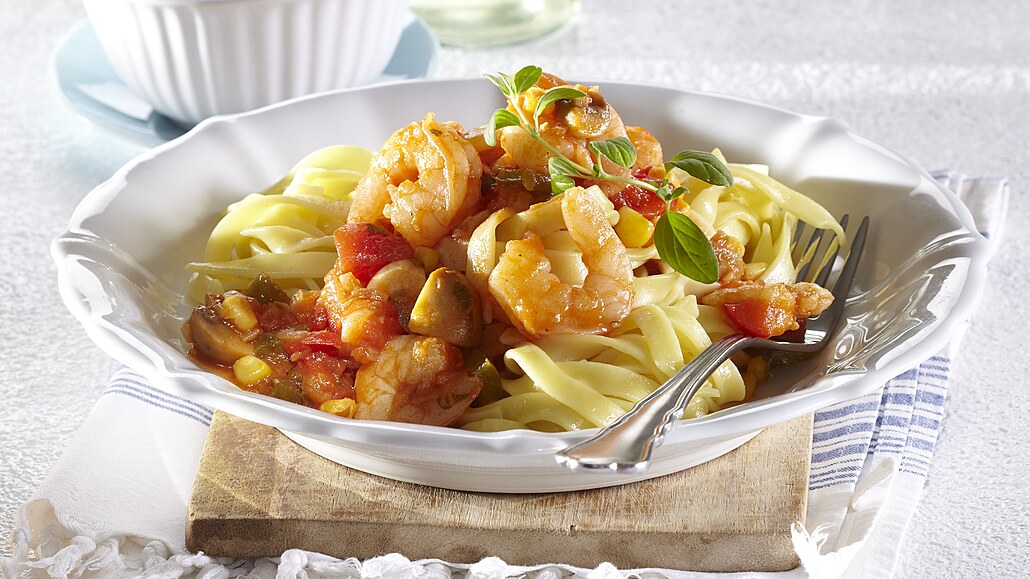 - Do omáčky vložíme očištěné krevety a kukuřici. Vaříme ještě asi 5 minut. Nakonec přidáme nasekanou šalvěj a podle potřeby ještě dochutíme. Uvařené těstoviny rozdělíme na talíře a přelijeme krevetami s omáčkou.
